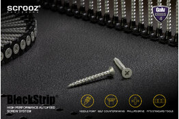 Our collated high performance single thread class 4 wood screws are made from HiCo super tough steel and wax coated and lubricated for rapid general purpose fixing and fastening of construction timber and sheet materials. They are self drilling and countersinking and are loaded in belts of 50 screws in Scrooz proprietary designed BlackStrip® FastBelt silicone strip for rapid jam-free feeding. Plus they also feature multi-connection lugs so you can join belts together for continuous feeding. Our belts are one size only and are optimised to fit most collated autofeed drivers. Supplied in trade boxes and discounted bulk master cartons for volume users, pallet rates available on request.