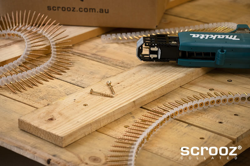 Here they are, Australia's only collated multi purpose wood screws for general everyday carpentry and construction. Capable of driving a screw a second, they're specifically designed for use in fast repetitive applications using standard inexpensive 'off the shelf' collated drivers, so you don't need to buy expensive special tools and unlike most overpriced systems, Scrooz collated screw prices are as low as possible.. as usual.