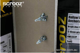 Made from AS 3566-compliant, CR3+ bright zinc plated steel, Scrooz Hollow Wall Anchors offer exceptional corrosion resistance and structural integrity. Available in M4, M5, and M6 sizes for wall thicknesses from 3mm to 24mm. All anchors are supplied with zinc-plated machine screws, ready to install.