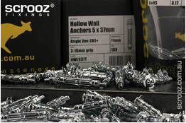 Made from AS 3566-compliant, CR3+ bright zinc plated steel, Scrooz Hollow Wall Anchors offer exceptional corrosion resistance and structural integrity. Available in M4, M5, and M6 sizes for wall thicknesses from 3mm to 24mm. All anchors are supplied with zinc-plated machine screws, ready to install.
