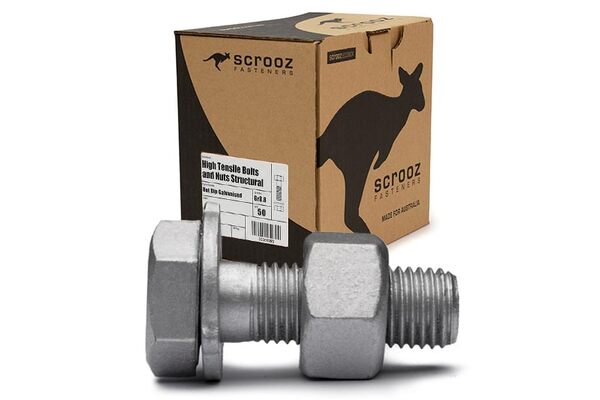 Scrooz Fasteners supplies a premium range of high tensile structural bolts and nuts assembled, specifically engineered for critical load-bearing applications in steel construction. Each assembly is fully compliant with Australian Standard K0 AS1252:2016 and includes a galvanised 8.8 grade hex head bolt, a deep structural nut, and a through-hardened washer - all pre-assembled for fast, reliable installation.