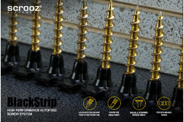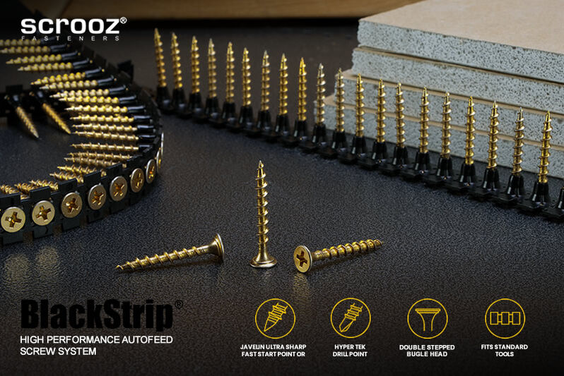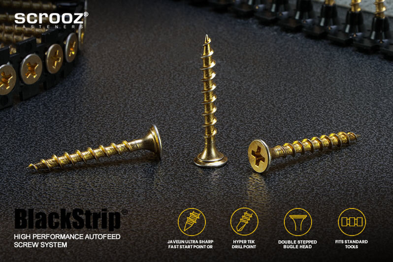 Features include specially designed rounded double countersunk stepped bugle heads to prevent damage and burring to the paper skin on plasterboard or gyprock sheets and prevent pull through during fastening along with an aggressive coarse single threadform to hold tight and drive fast in timber. Scrooz BlackStrip® plasterboard screws also feature our proprietory Javelin super sharp drilling points with optimised needle point angles and dimensions for rapid starting and super fast driving.