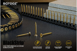 Our screws are wax coated and lubricated and loaded in belts of 50 into Scrooz proprietary designed BlackStrip® FastBelt silicone strips for fast, repetitive and consistent driving without jamming. All BlackStrip® belts feature multi-connection lugs so you can join them together for continuous feeding, they are one size only and are designed to fit most collated tools.