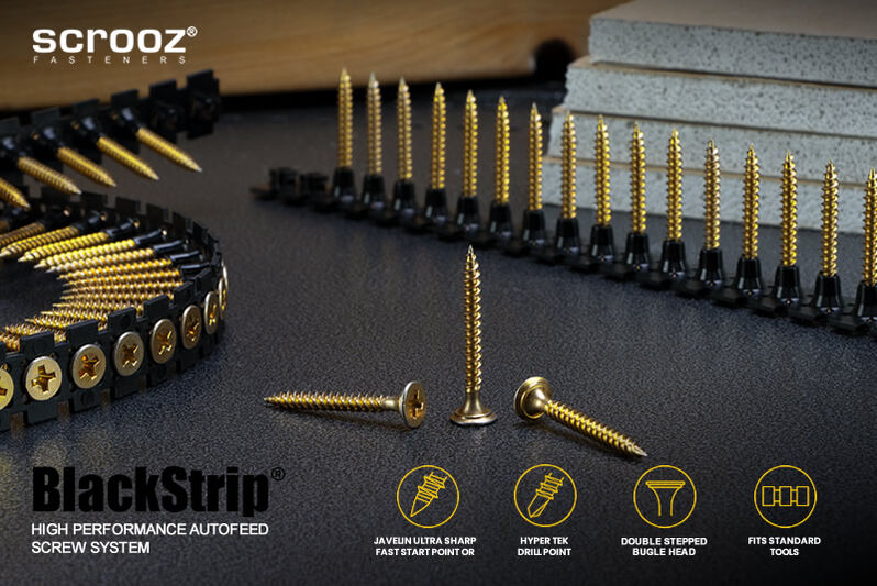 Features include specially designed rounded double countersunk stepped bugle heads to prevent damage and burring to the paper skin on plasterboard or gyprock sheets and prevent pull through during fastening. Scrooz BlackStrip® plasterboard screws also feature our proprietory Javelin super sharp drilling points with optimised needle point angles and dimensions for rapid starting and super fast driving.