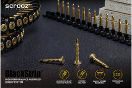 Our screws are wax coated and lubricated and loaded in belts of 50 into Scrooz proprietary designed BlackStrip® FastBelt silicone strips for fast, repetitive and consistent driving without jamming. All BlackStrip® belts feature multi-connection lugs so you can join them together for continuous feeding, they are one size only and are designed to fit most collated tools.