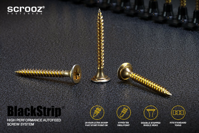 Features include specially designed rounded double countersunk stepped bugle heads to prevent damage and burring to the paper skin on plasterboard or gyprock sheets and prevent pull through during fastening. Scrooz BlackStrip® plasterboard screws also feature our proprietory Javelin super sharp drilling points with optimised needle point angles and dimensions for rapid starting and super fast driving.