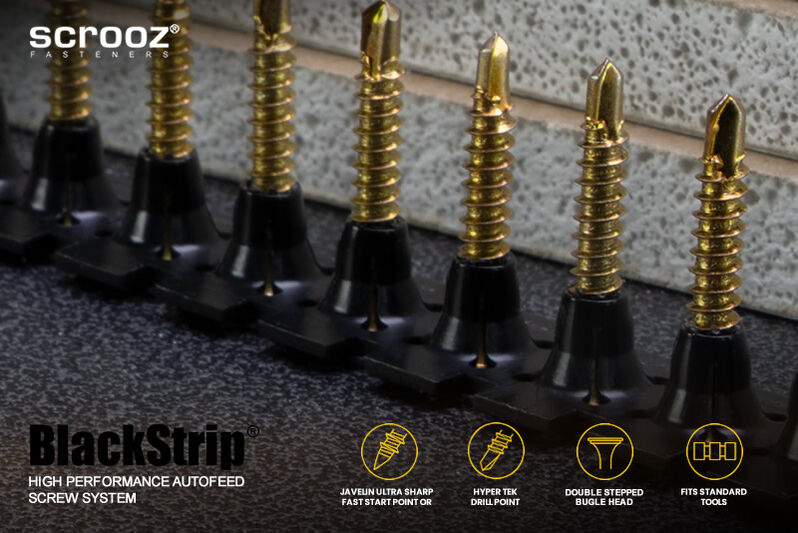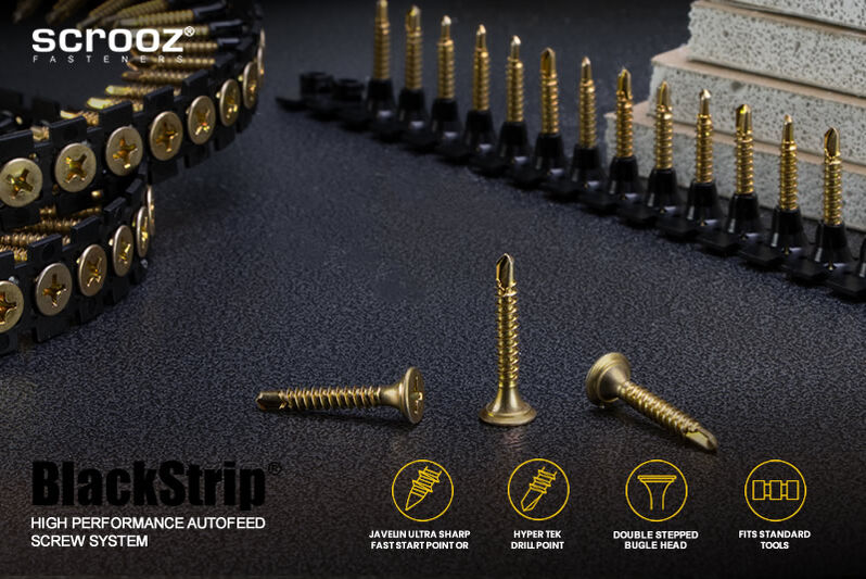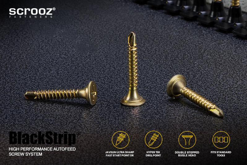 Features include specially designed rounded double countersunk stepped bugle heads to prevent damage and burring to the paper skin on plasterboard or gyprock sheets and prevent pull through during fastening. Scrooz BlackStrip® plasterboard metal screws also feature our proprietory Hyper Tek super sharp drilling points with optimised drill point angles and dimensions for rapid starting and super fast driving.