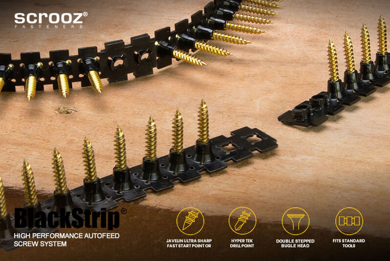 Our screws are wax coated and lubricated and loaded in belts of 50 into Scrooz proprietary designed BlackStrip® FastBelt silicone strips for fast, repetitive and consistent driving without jamming. All BlackStrip® belts feature multi-connection lugs so you can join them together for continuous feeding, they are one size only and are designed to fit most collated tools.